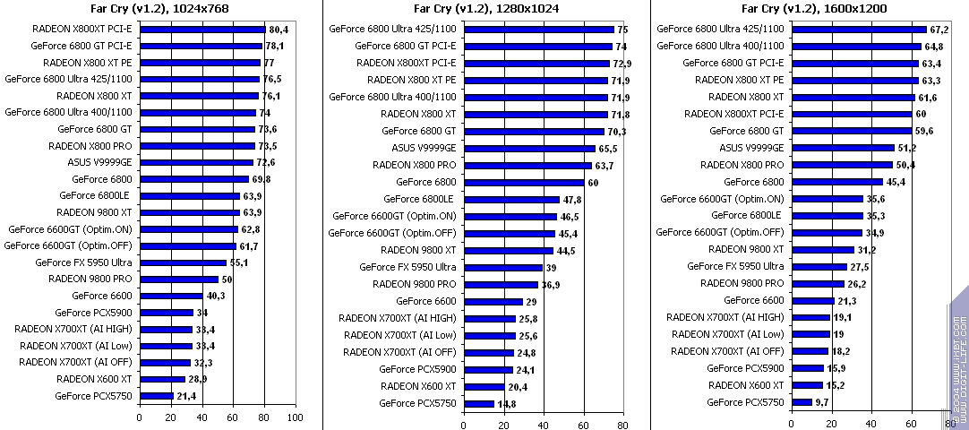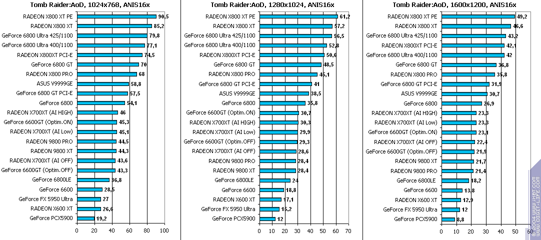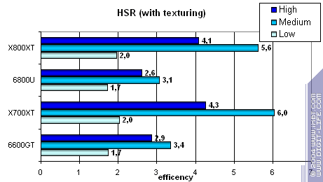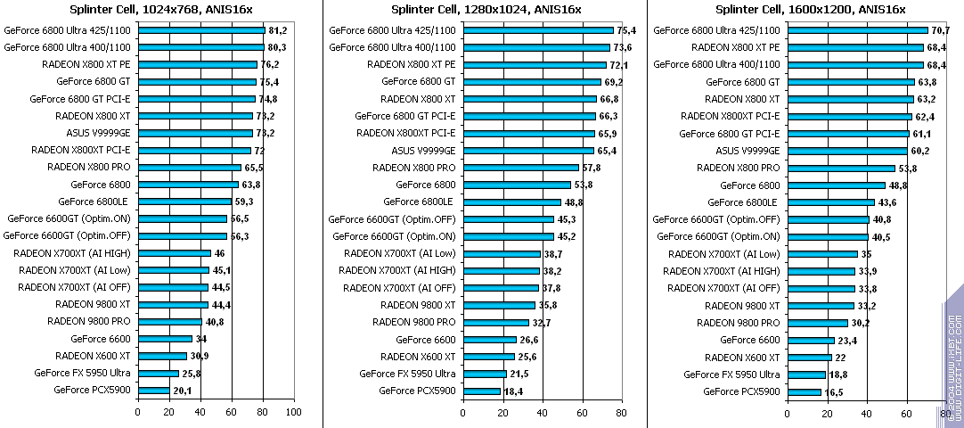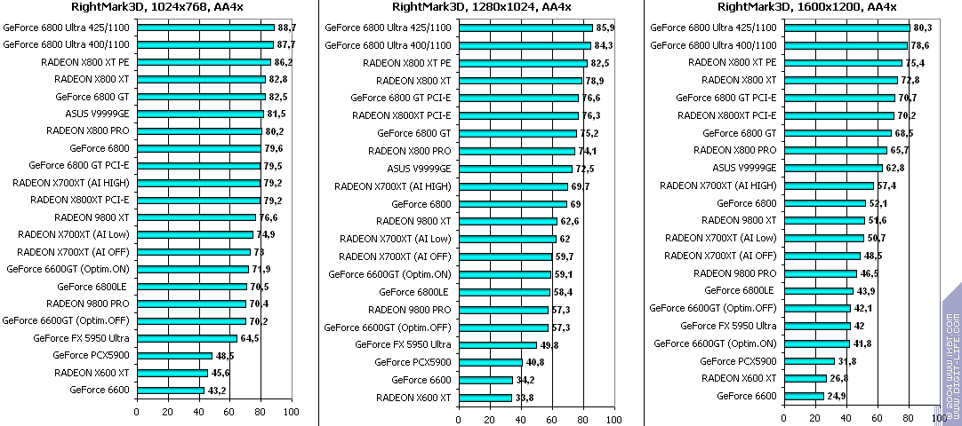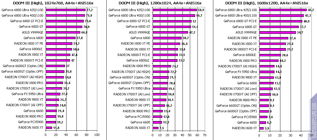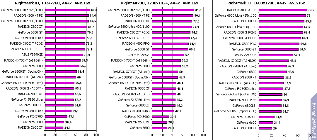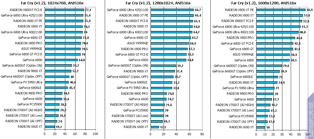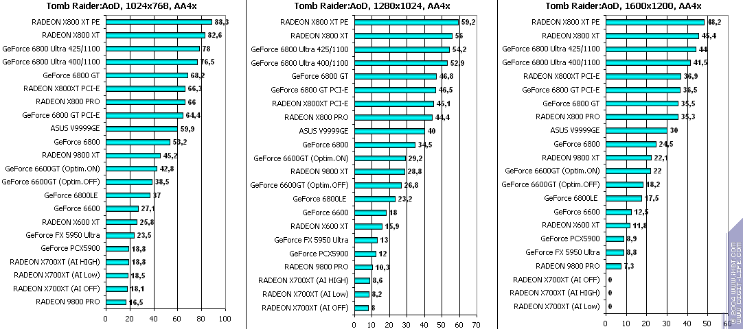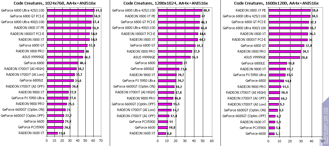 - RADEON X700XT — против GeForce 6600GT победа только при High A.I.;