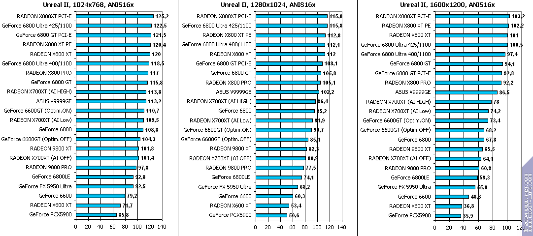 При включенной анизотропии: только в High-режиме оптимизаций X700XT удается вырвать победу, в остальных же случаях лидер — 6600GT. Оптимизации под АФ здесь у X700 очень плодотворны. Придется исследовать качество.