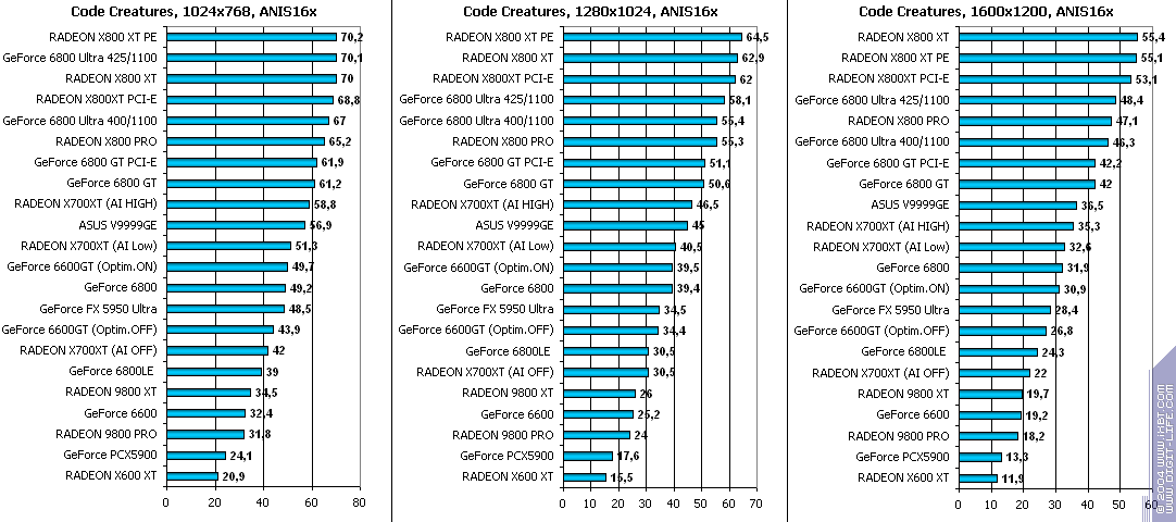 - RADEON X700XT — против GeForce 6800LE (ATHLON64 3400+) оптимизации АФ снова дали шапку лидера карте X700XT;