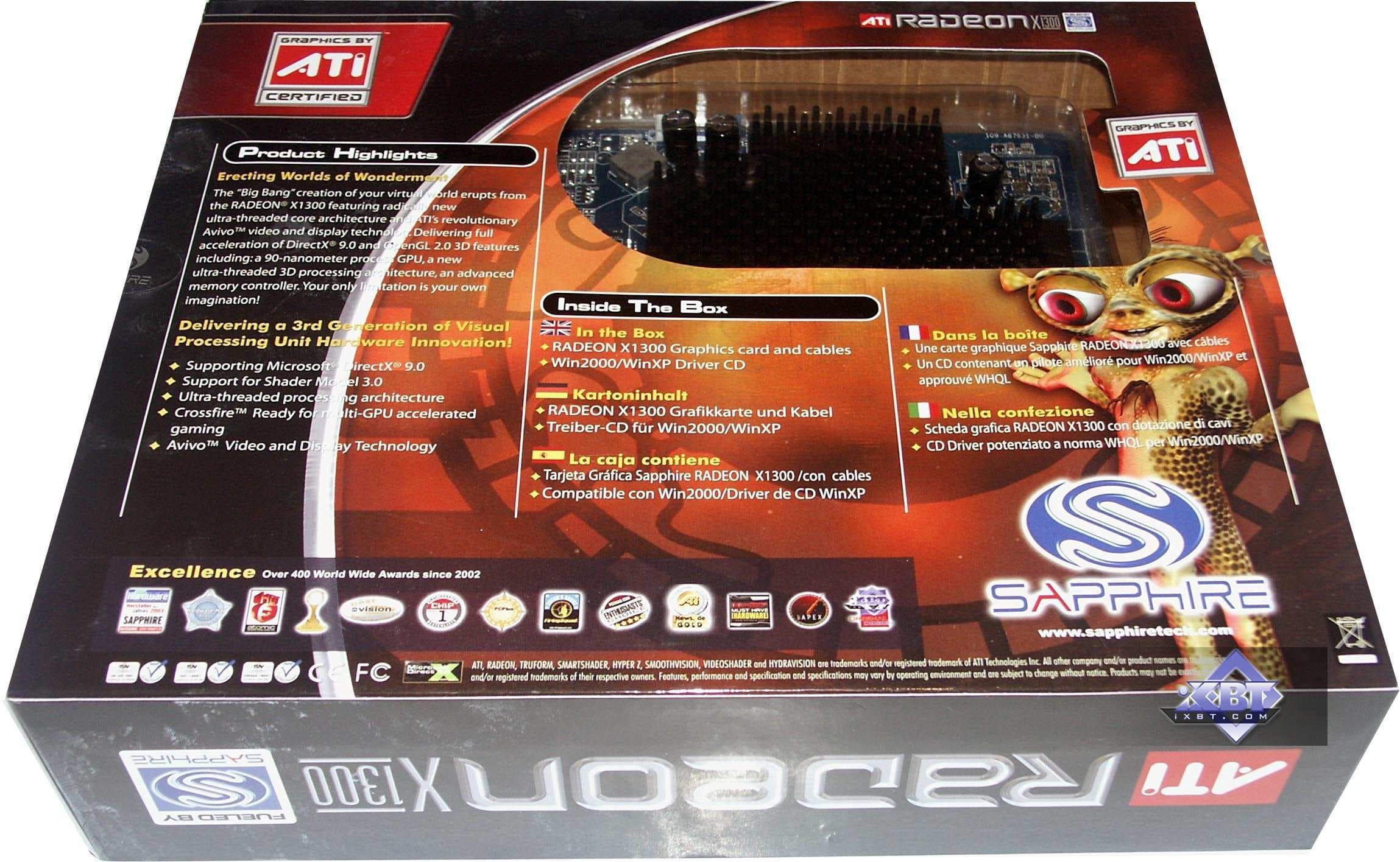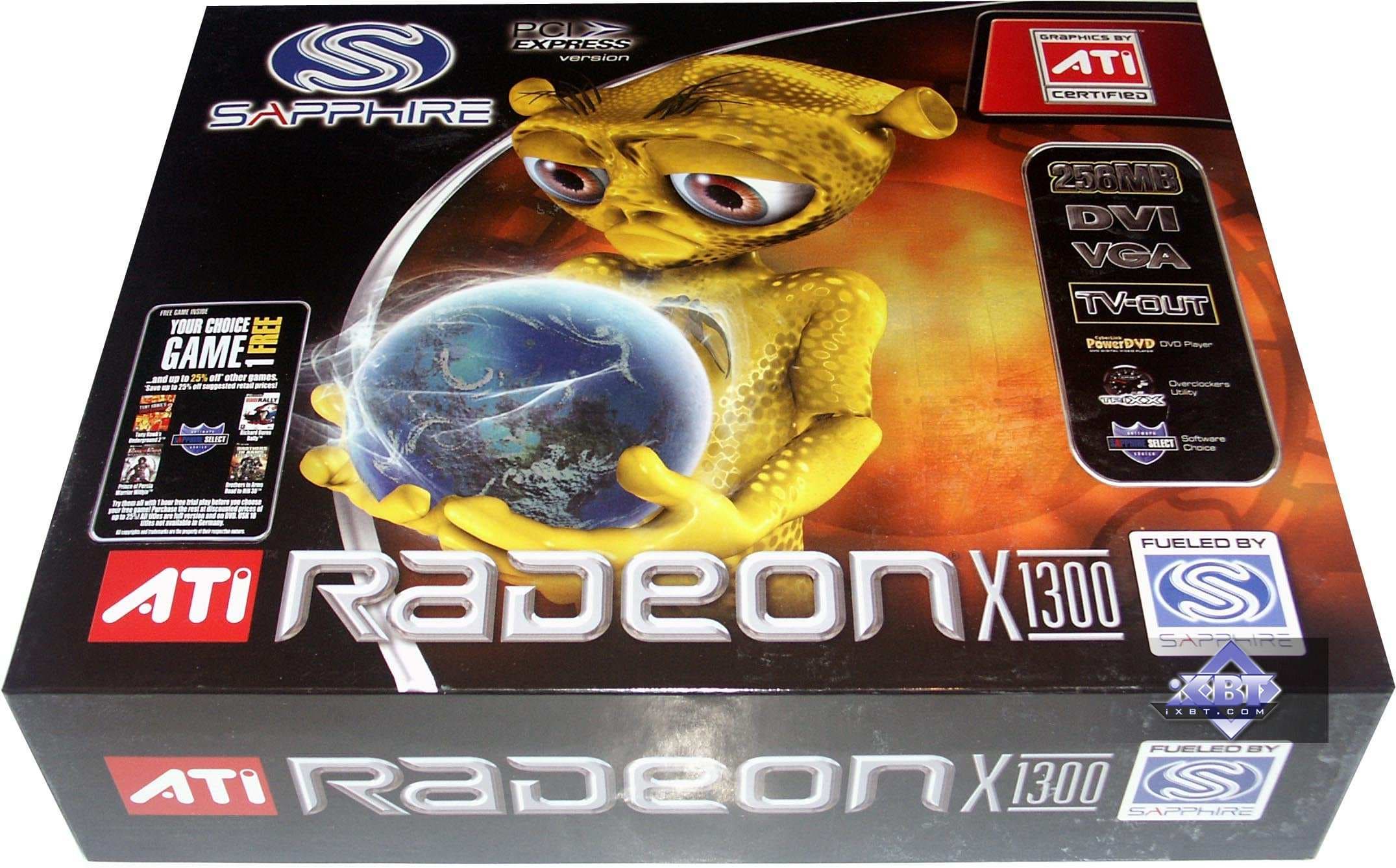 - Sapphire RADEON X1300 PCI-E 256MB — самая младшая карта из нового семейства X1xxx. Показала себя очень достойно, обошла многих конкурентов по своей цене в 70-90 долларов США (на начало года). Качество исполнения на высоте, однако есть проблема с нагревом. Гонясь за тишиной, разработчики как-то забыли, что видеокарта стоит внутри системного блока, и даже если она сама способна работать в жаре, то рядои находящиеся комплектующие могут и перегреться.