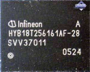 | Карта имеет 256 МБ памяти DDR SDRAM, размещенной в 8-ми микросхемах на лицевой и оборотной сторонах PCB. Микросхемы памяти Infineon (DDR). Время выборки у микросхем памяти 2.8 ns, что соответствует частоте работы 350 (700) МГц. | ![]() |
