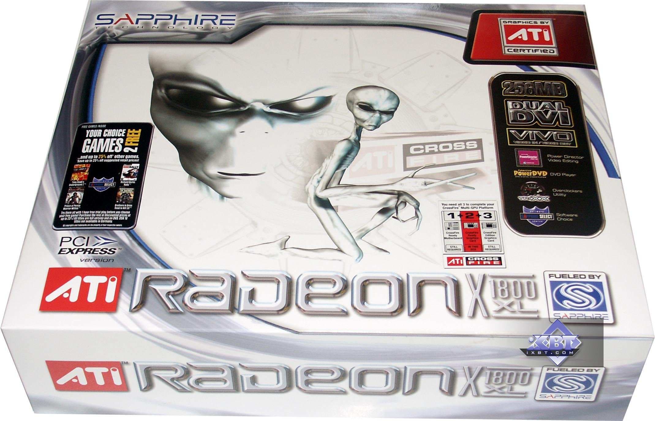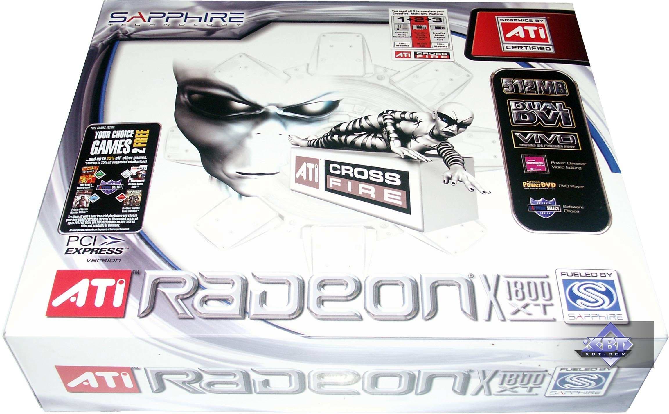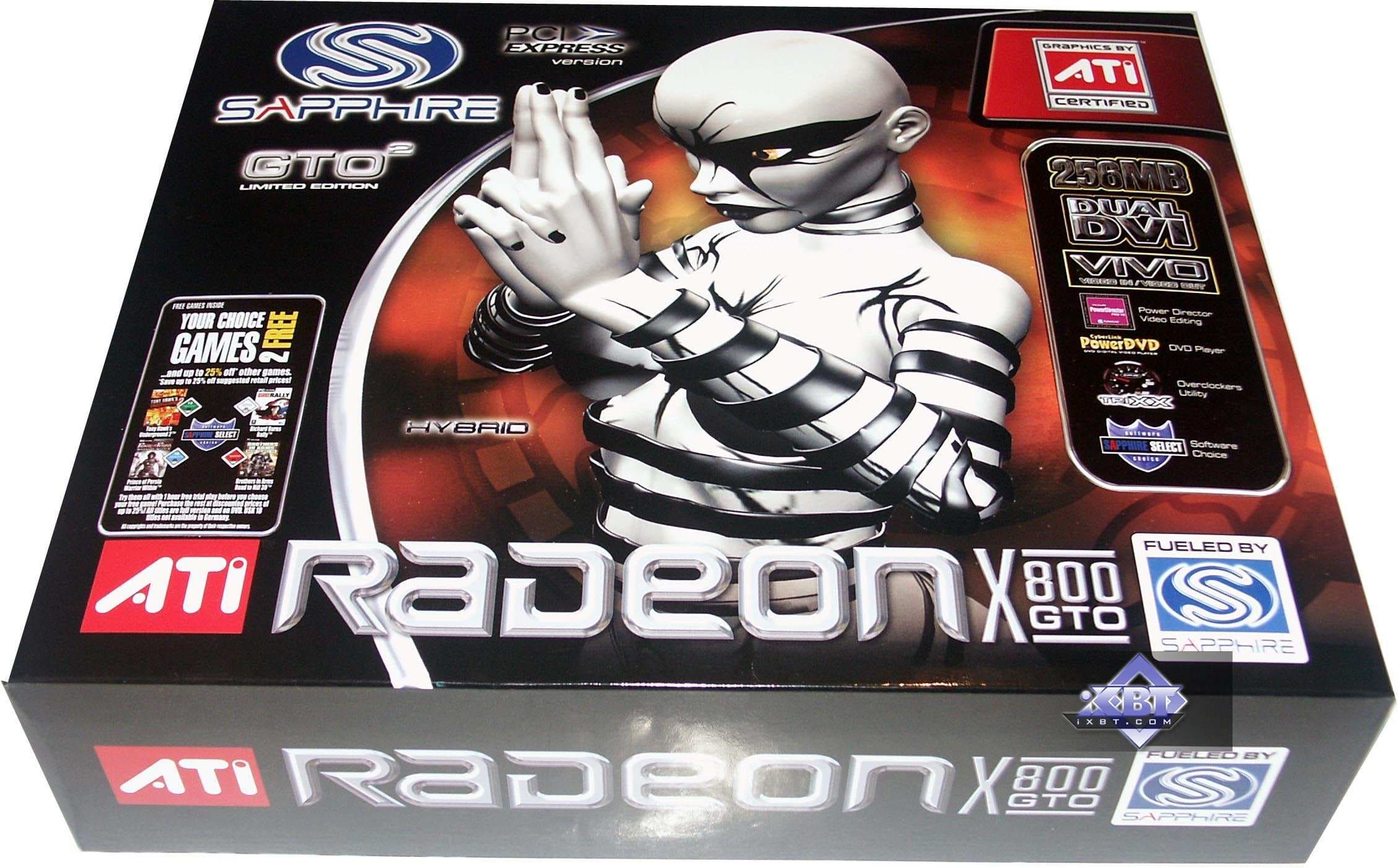 - Sapphire RADEON X800GTO2 PCI-E 256MB — карта с теми же характеристиками, что и предыдущий продукт, однако, вместо ожидаемых 12-ти, мы увидели 16 конвейеров на GPU. То есть перед нами тот же X800 XL, но с ядром, способным легко работать на 520 и выше МГц. Поэтому легко из такой карты сделать X850 XT PE. Но все же напомню, что вообще-то GTO2 — это то же самое, что GTO, но ядро аппаратно не заблокировано. То есть оверклокер может прошить BIOS со всеми включенными конвейерами и получить искомое. Я не могу обещать, что все подобные карты будут идти в продажу уже с разблокированными 16-ю конвейерами.
