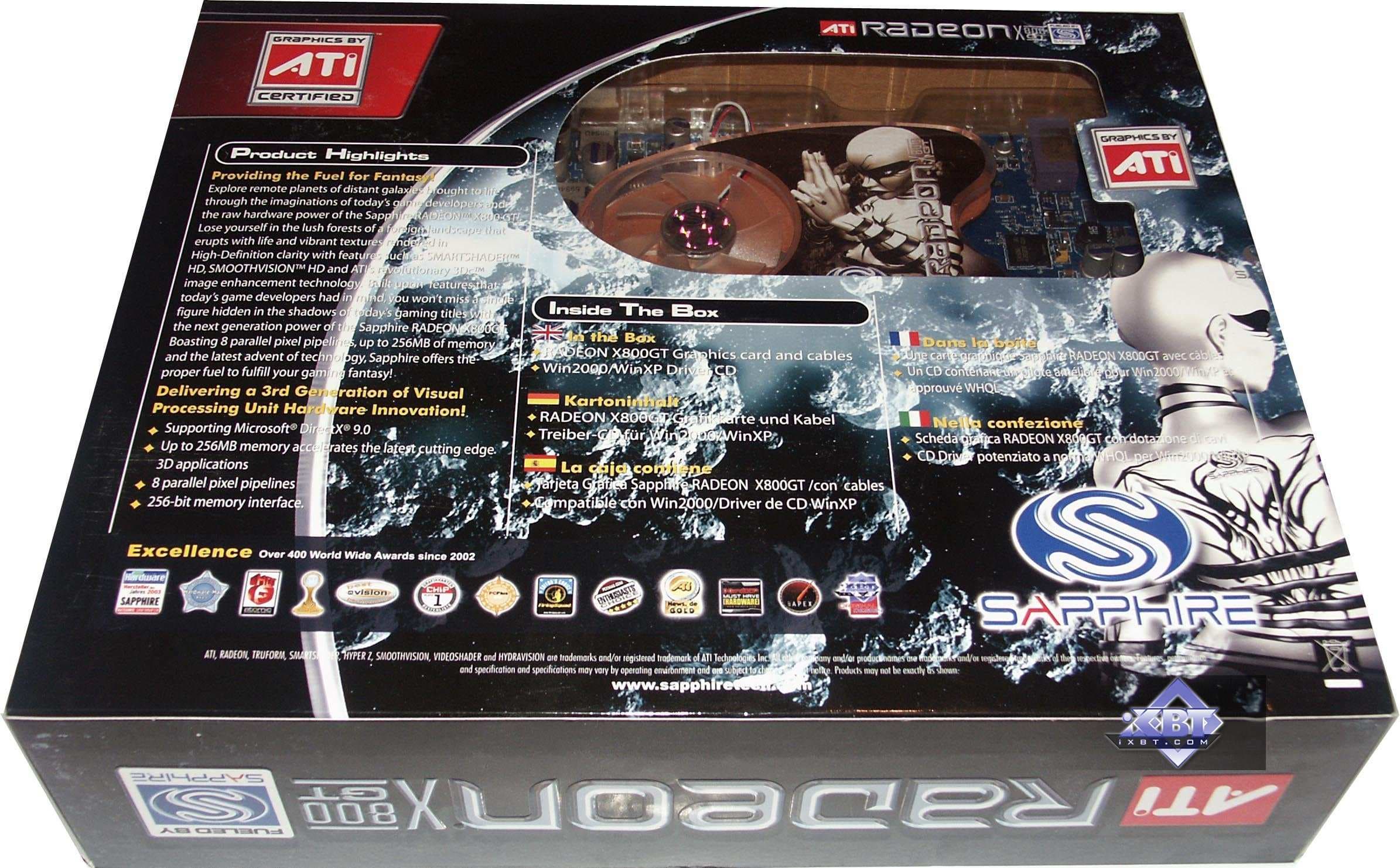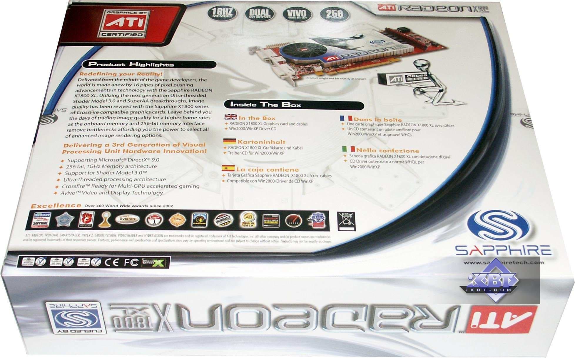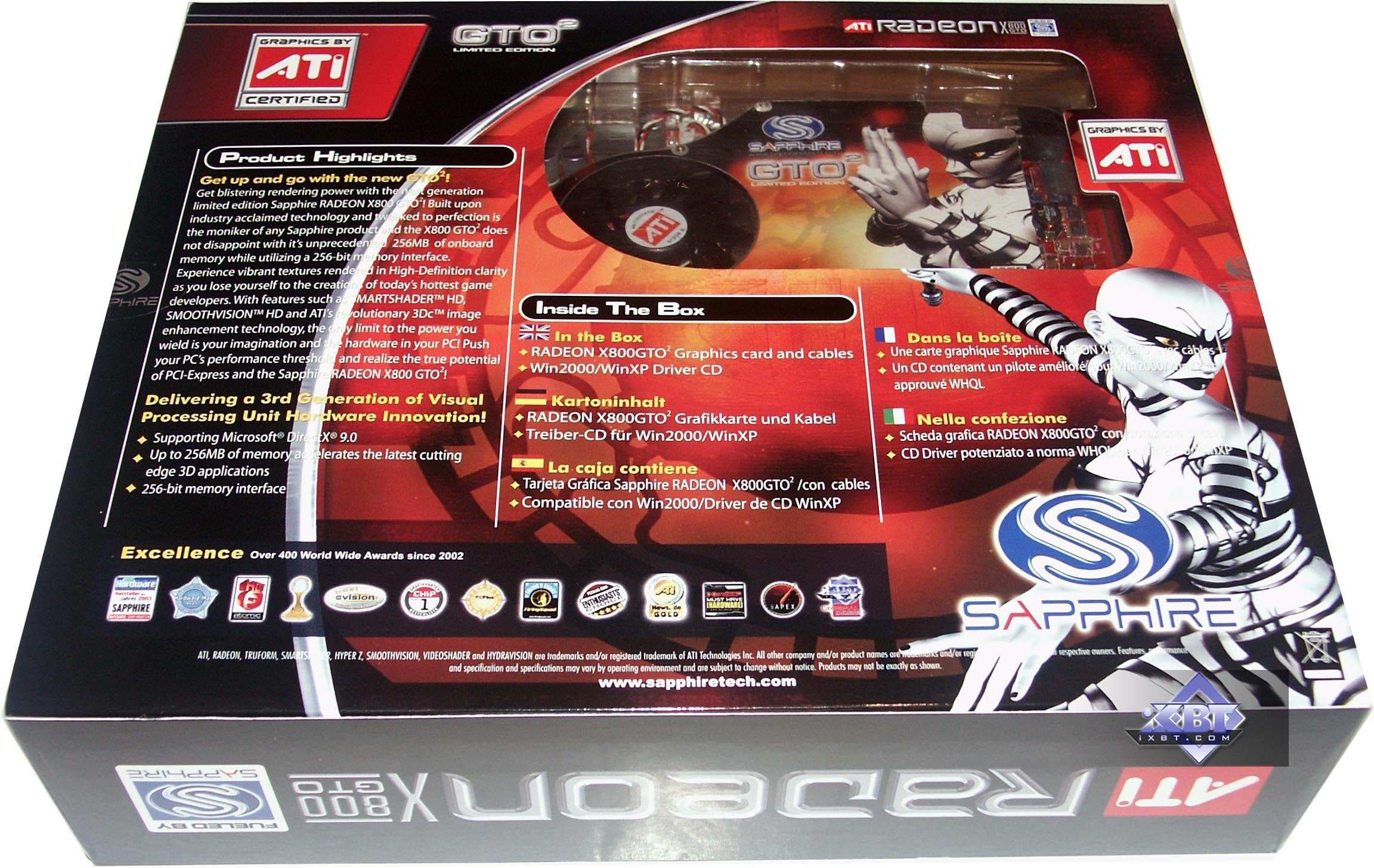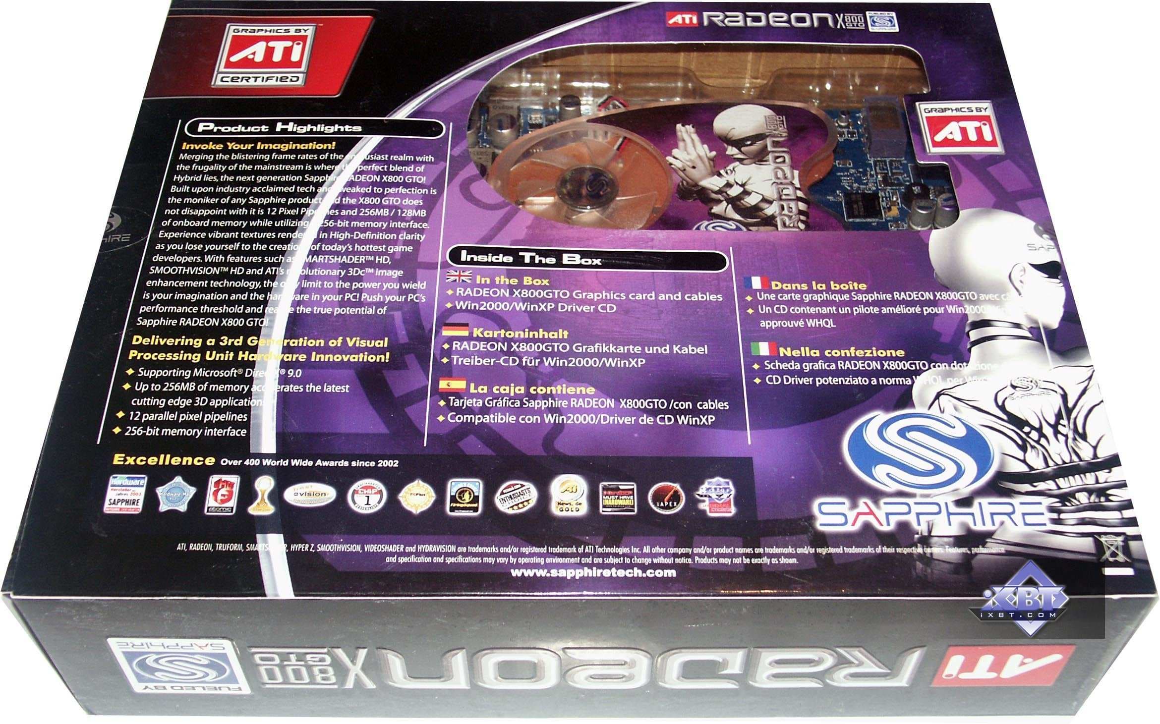 - Sapphire RADEON X800GTO2 PCI-E 256MB — карта с теми же характеристиками, что и предыдущий продукт, однако, вместо ожидаемых 12-ти, мы увидели 16 конвейеров на GPU. То есть перед нами тот же X800 XL, но с ядром, способным легко работать на 520 и выше МГц. Поэтому легко из такой карты сделать X850 XT PE. Но все же напомню, что вообще-то GTO2 — это то же самое, что GTO, но ядро аппаратно не заблокировано. То есть оверклокер может прошить BIOS со всеми включенными конвейерами и получить искомое. Я не могу обещать, что все подобные карты будут идти в продажу уже с разблокированными 16-ю конвейерами.
