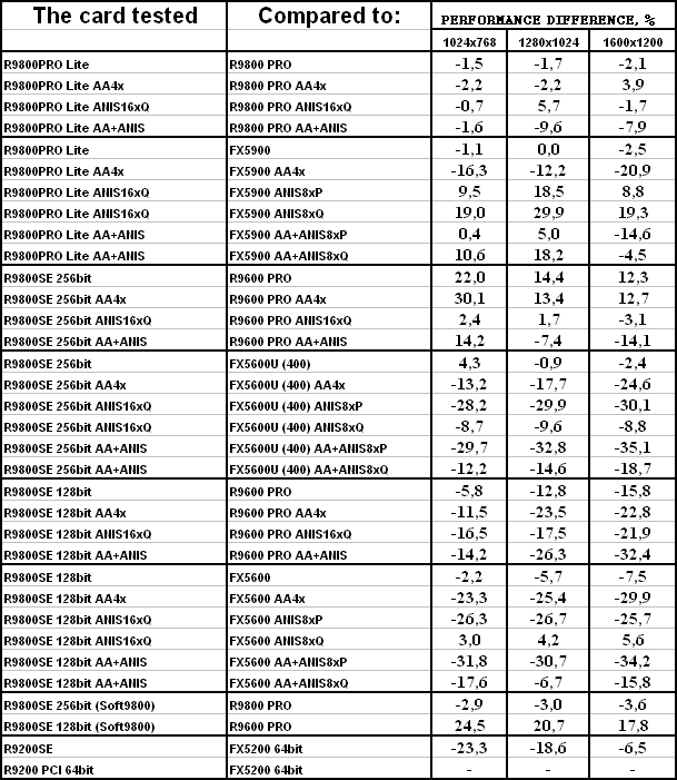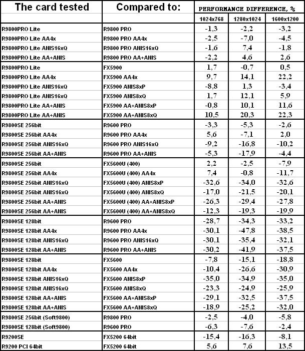 RADEON 9800 PRO Lite где-то отстает от обычного RADEON 9800 PRO, где-то опережает. То же самое и в соперничестве с GeForce FX 5900.