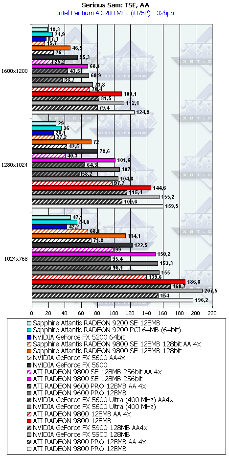 А вот RADEON 9800SE со 128-битной шиной оказался очень слабым против RADEON 9600 PRO (впрочем, не мудрено с 325 МГц против 400 МГц). Да и сопернику FX 5600 проиграл. И даже разблокирование конвейеров не помогло RADEON 9800SE обойти RADEON 9600 PRO.