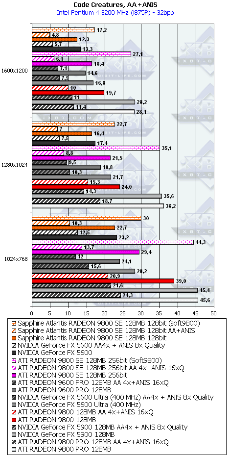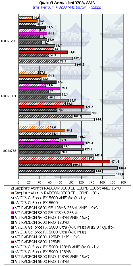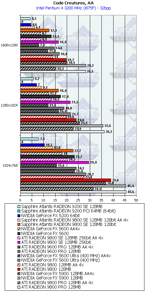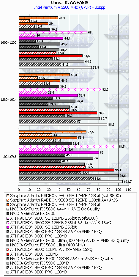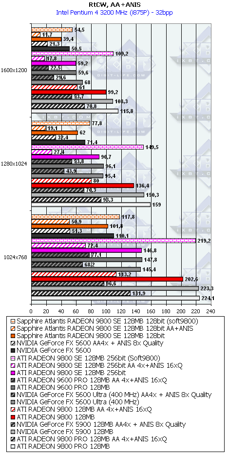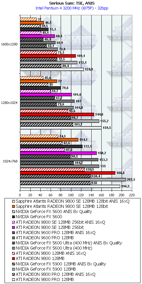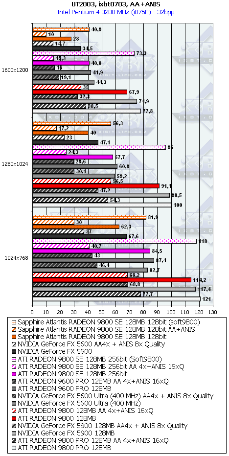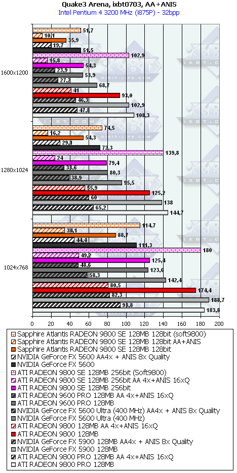 УНИКАЛЬНЫЙ случай! RADEON 9800SE с 256-битной шиной проиграла карте со 128-битной шиной на базе RADEON 9600 PRO именно в АА! Что-то явно тут не так с драйверами. Ну и как результат, самый тяжелый режим также проигран, как и поединок с GeForce FX 5600 Ultra (400 MHz). Разблокирование конвейеров привело к тому, что эта карта стала почти равной RADEON 9800 PRO.