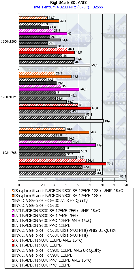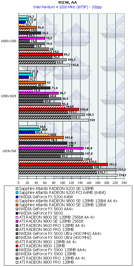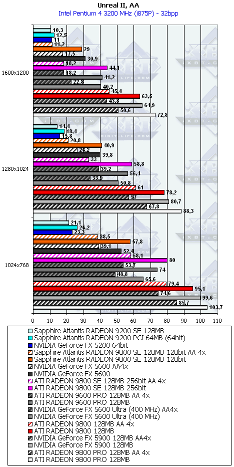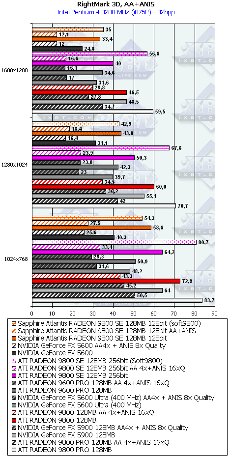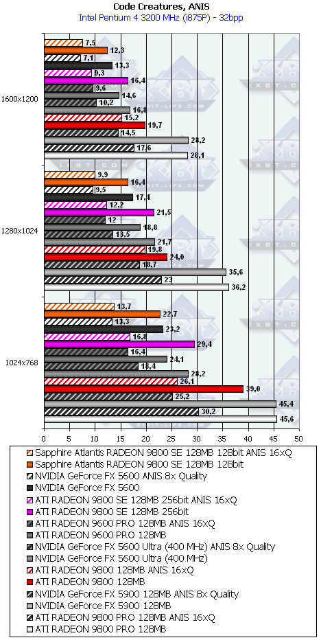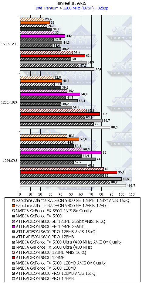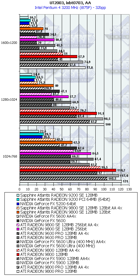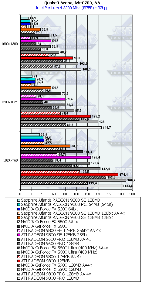 УНИКАЛЬНЫЙ случай! RADEON 9800SE с 256-битной шиной проиграла карте со 128-битной шиной на базе RADEON 9600 PRO именно в АА! Что-то явно тут не так с драйверами. Ну и как результат, самый тяжелый режим также проигран, как и поединок с GeForce FX 5600 Ultra (400 MHz). Разблокирование конвейеров привело к тому, что эта карта стала почти равной RADEON 9800 PRO.