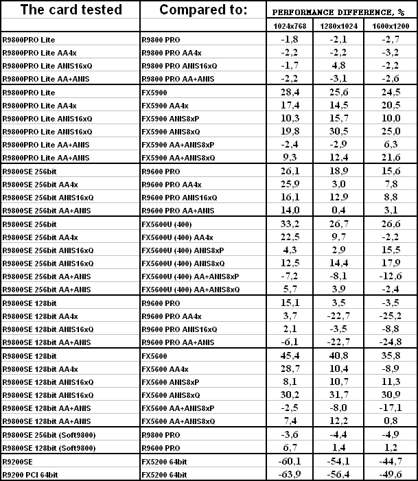 В целом RADEON 9800 PRO Lite почти равен обычному RADEON 9800 PRO, а также констатируем победу над GeForce FX 5900.