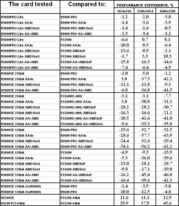RADEON 9800SE с 256-битной шиной снова проиграла карте со 128-битной шиной на базе RADEON 9600 PRO, как и GeForce FX 5600 Ultra (400 MHz). Разблокирование конвейеров привело к тому, что эта карта стала почти равной RADEON 9800 PRO.