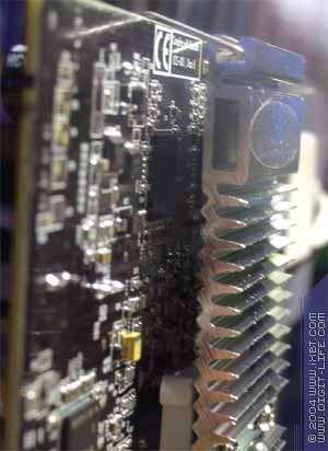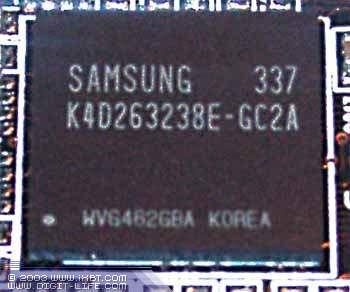 | Микросхемы памяти Samsung. Время выборки у микросхем памяти 2.8 ns, что соответствует частоте работы 350 (700) МГц, память же работает на частоте 325 (650) МГц. Частота работы GPU 500 MHz, но гарантируется работа на 532 MHz. Шина обмена с памятью 128 bit. | ![]() |