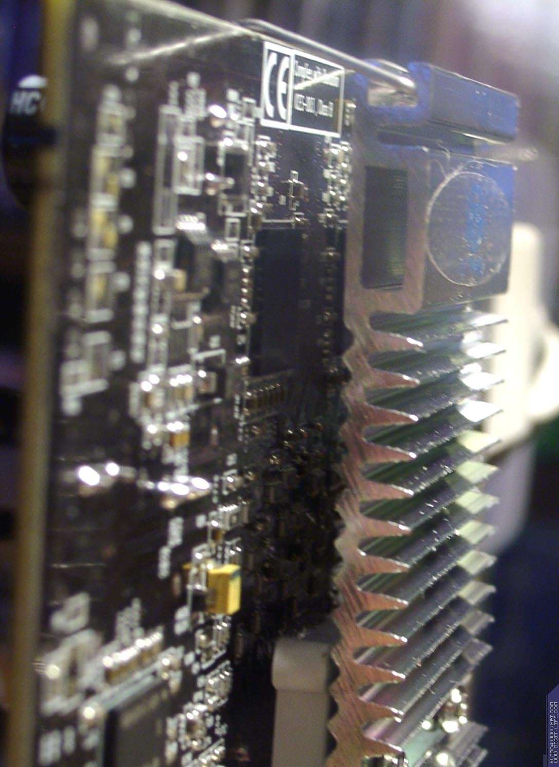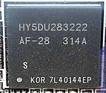 | Микросхемы памяти производства Hynix. Время выборки у микросхем памяти 2.8 ns, что соответствует частоте работы 350 (700) МГц, память же работает на частоте 300 (600) МГц. Частота работы GPU 500 MHz. Шина обмена с памятью 128 bit. | ![]() |