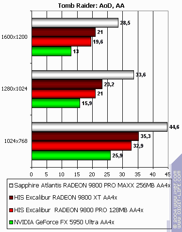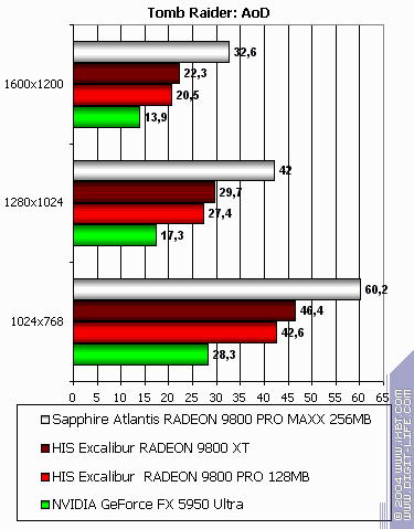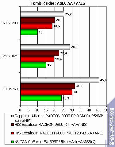 - Tomb Raider: Angel of Darkness v.49 (Core Design/Eldos Software) DirectX 9.0, три разных записанных demo. Тестирование проводилось при максимально установленном качестве, выключены были лишь Depth of Fields PS20. Настройки тестирования приведены здесь.
