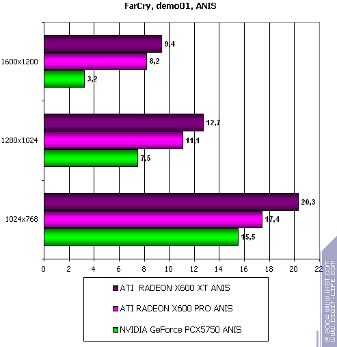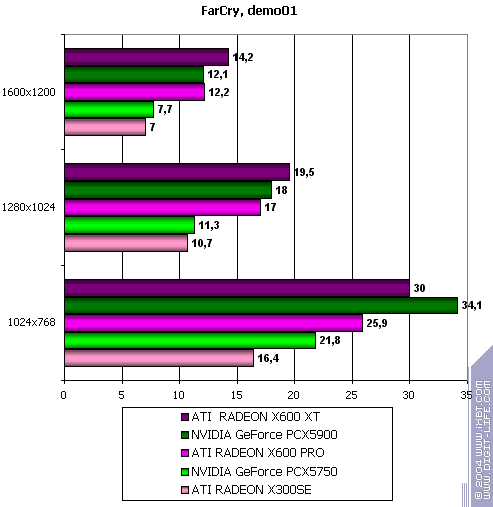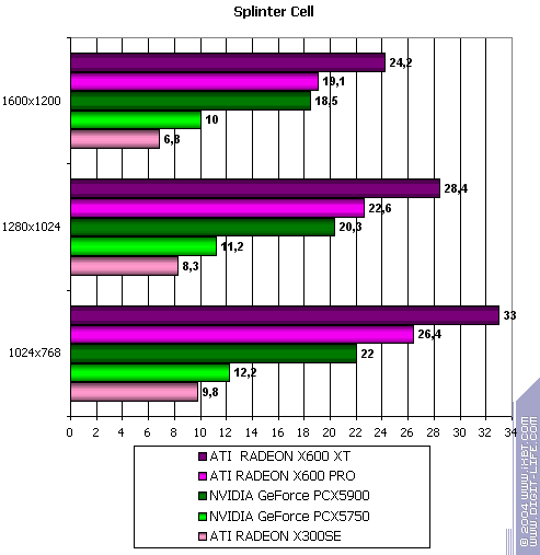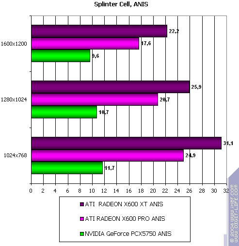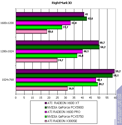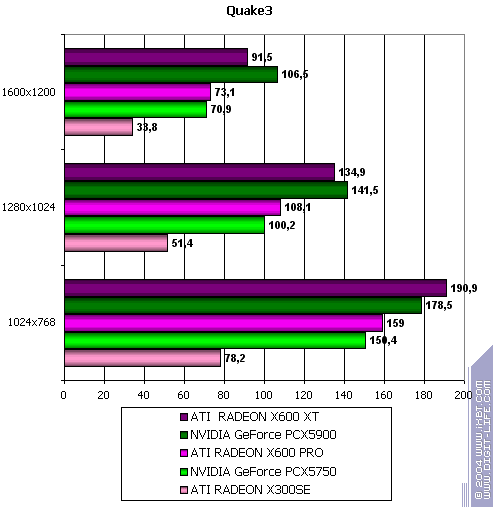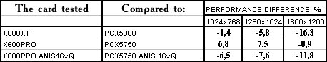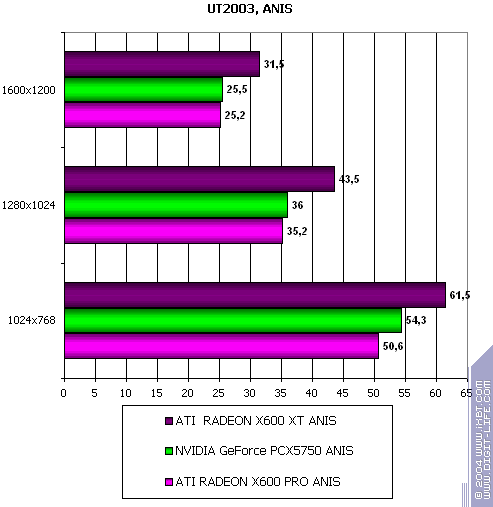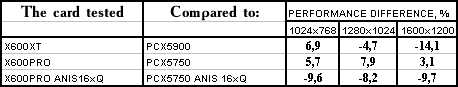 Я не буду комментировать каждый тест, думаю, что читатели сам по таблицам с процентами все поймут :). Замечу лишь, что X600XT/PRO тестировались как в обычном режиме, так и с включенной анизотропией, а X300SE по причине маломощности — только в обычном режиме, и к сожалению, она пока не имеет конкурента себе среди аналогов от NVIDIA.