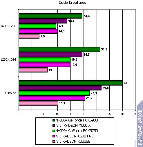 - Code Creatures Benchmark Pro (CodeCult) игровой тест, демонстрирующий работу платы в DirectX 8.1, Shaders, HW T&L.