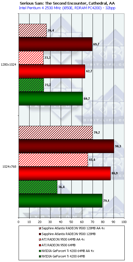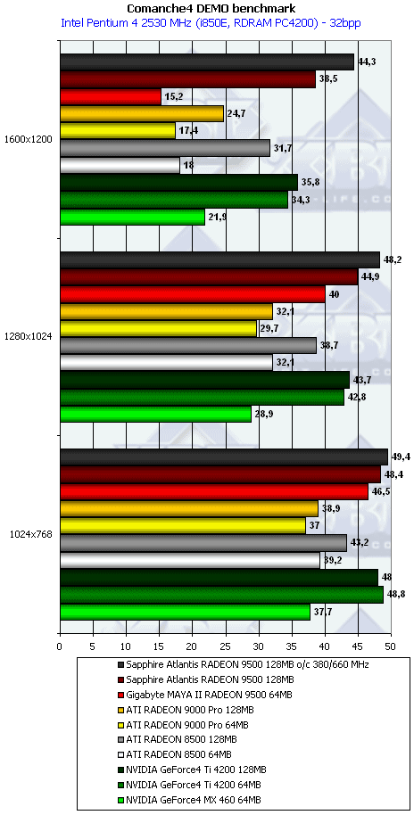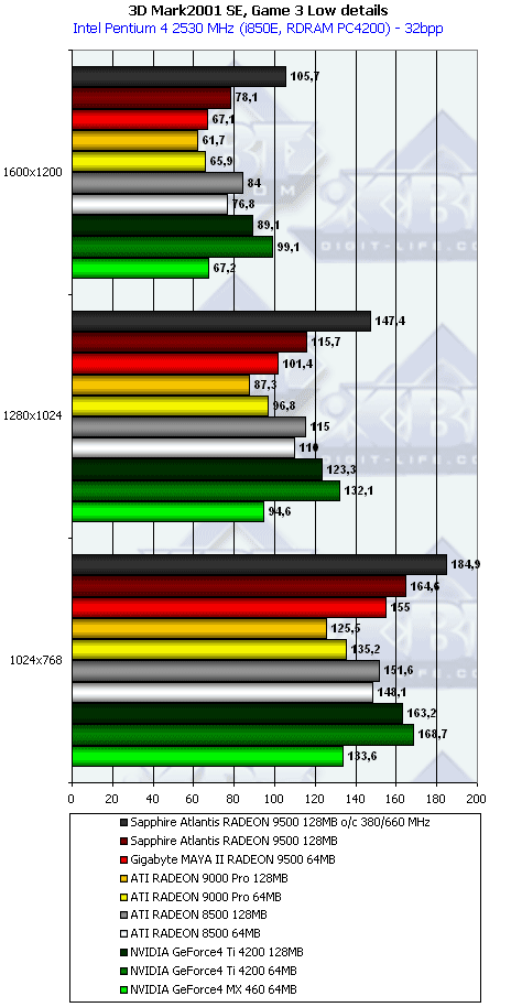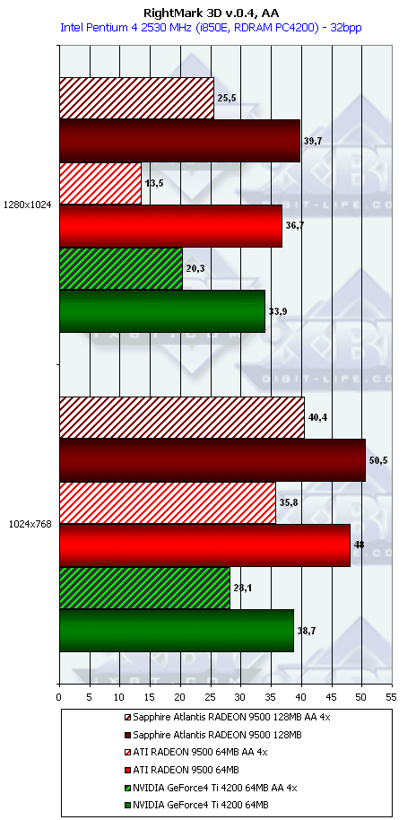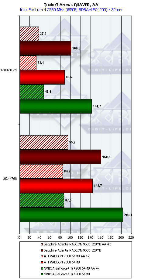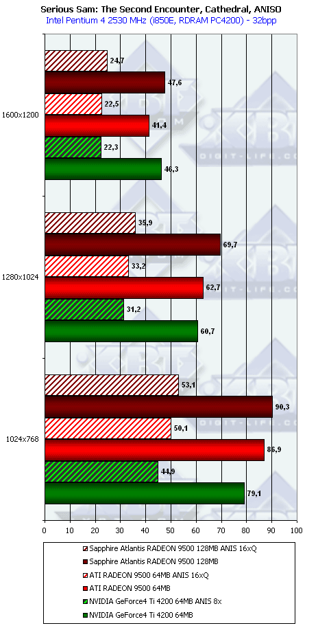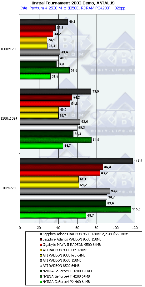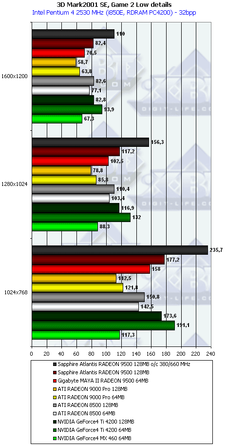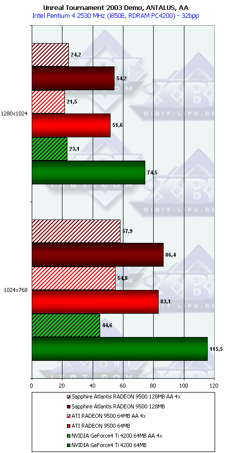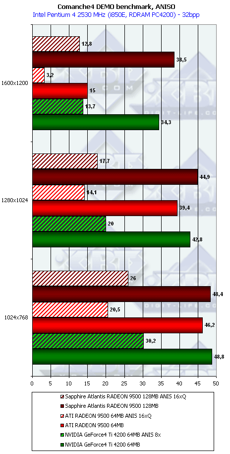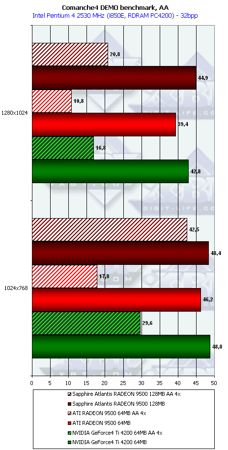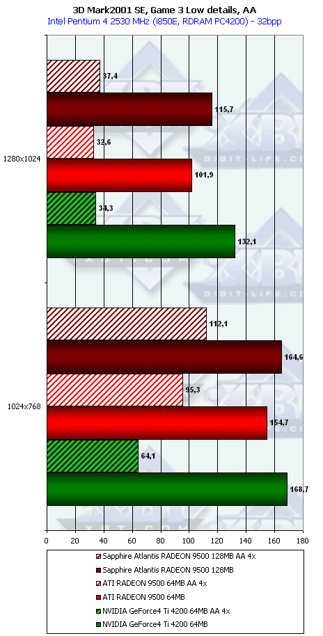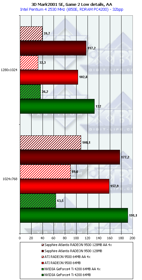В самом конце этого списка есть наш обзор RADEON 9500, где мы познакомились с этим продуктом и выяснили, что по производительности он не так уж и хорош для своей цены в $140-150. И сделали вывод, что проигрыш карте на базе Ti 4200 во многих случаях нивелирует все плюсы поддержки DX9. А кроме того, кое-где RADEON 9500 проиграл конкуренту и в режимах с АА и анизотропией. И поэтому красная цена такой карте не выше $120.