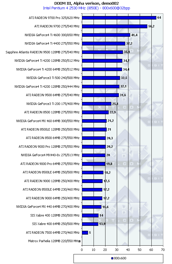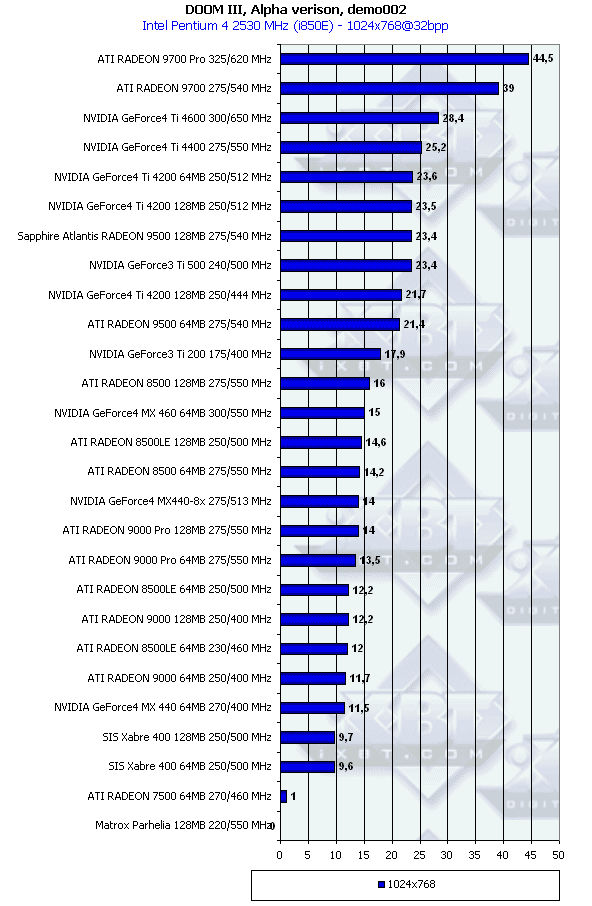 Мы решили протестировать массу видеокарт в альфа-версии будущего хита DOOM III, не так давно "утекшей в Сеть". Хотя в комплекте с этой полу-игрой есть своя демо, мы решили воспользоваться любезно предоставленными сотрудниками информационного ресурса 3DNews.ru двумя демо. Это demo002 и demo006. За подробностями относительно того, как и где их взять просим обращаться на сайт 3DNews, где есть обзор DOOM III v.0.02, в котором указанные demo принимали участие.
