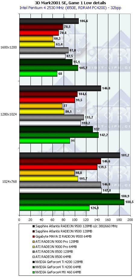 Пока не появится специально разработанный дизайн для карт на базе RADEON 9500 (а есть вероятность, что они никогда не появятся, ибо чем больше времени проходит, тем дешевле становится производство карт по существующему дизайну), надо понимать, что 64-х и 128-ми мегабайтные карты отличаются интерфейсом обмена с памятью: 128 и 256 бит. Это не может не отразиться на производительности, хотя индульгенция обманчива: слишком уж урезан VPU, даже 256-битная шина вряд ли поможет 4-х конвейерному чипу кардинально поднять скорость (но, как показали наши исследования ниже, рост производительности ощутим).
