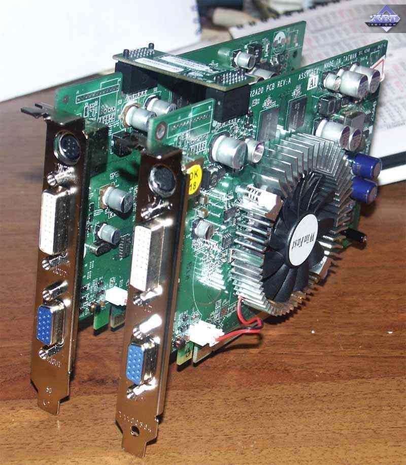 Заметим, что внутри соответствующих чипов (NV45, NV43) имеется специальный блок, отвечающий за SLI, он работает с общими ресурсами для двух плат. Обмен данными производится по шине, а синхронизация — через специальный переходник-коммутатор, одеваемый на обе карты (см. на снимках ниже).