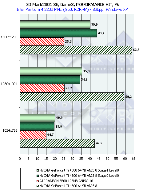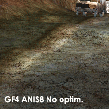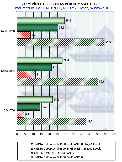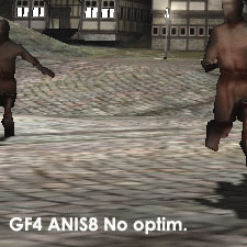 В предыдущем материале по картам на базе GeForce4 Ti 4200 (3-я часть) мы уже говорили, что эта функция у карт семейства GeForce4 Ti является очень и очень "прожорливой", и при активизации анизотропии уровня 8 производительность падает подчас больше, чем на 50-55%. Несмотря на то, что реализация анизотропки у NVIDIA наиболее честная, и обрабатываются все без исключения поверхности вне зависимости от угла наклона плоскостей объектов относительно взгляда пользователя, все же чрезвычайно сильное падение скорости при включении этой функции сильно расстраивает и раздражает. Подробности о реализации анизотропной фильтрации у ATI и NVIDIA можно узнать из наших 3DGiТогов, в разделе, посвященном анизотропке.