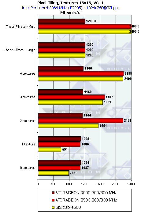 Какой напрашивается вывод? 2 конвейера по 4 текстурных модуля на каждом. То, что по спецификациям Xabre умеет работать только с 4-мя текстурами, лишний раз это может подтвердить. Вероятно, это и объясняет то, что Xabre600 показывает более скромные результаты, чем GeForce4 Ti, хотя по спецификациям должен догонять последний. А игр, которые используют 4 текстуры, пока очень мало, поэтому половина текстурников попросту простаивают.