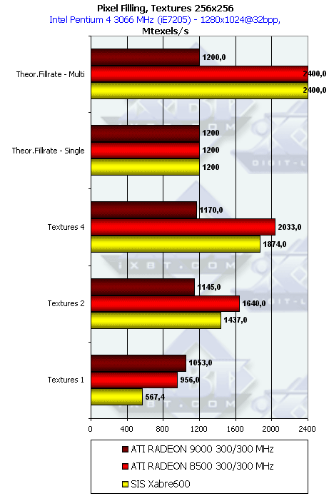 Не так давно в Сети появились слухи, что у Xabre вовсе не 4 конвейера. И я решил это дело проверить. Для этого использовался тест Pixel Filling из пакета RightMark3D (о самом пакете очень подробно расписано в обзоре GeForce FX)