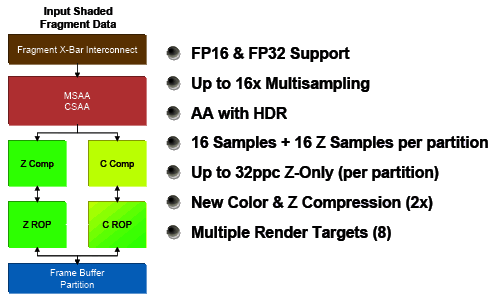 Каждый из блоков обрабатывает по четыре пикселя или 16 субпикселей, и всего получается 16 пикселей за такт для цвета и Z. В режиме только Z обрабатывается в два раза большее количество сэмплов за один такт. При MSAA 16х чип может выдавать два пикселя за такт, при 4х 8 и т.д. Как и в G80, полноценно поддерживаются форматы буфера кадров FP32 и FP16 совместно с антиалиасингом.