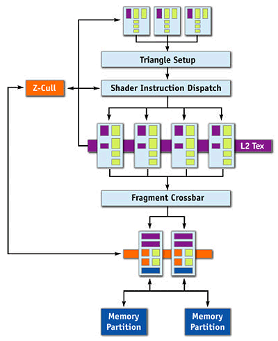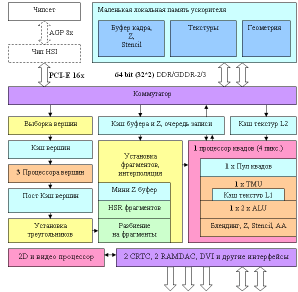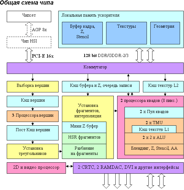 Архитектура вершинных и пиксельных процессоров, а также видеопроцессора осталась прежней эти элементы были детально описаны нами выше. Если не считать декларируемых доработок для эффективной адресации системной памяти из блоков текстурирования и блендинга. Однако это то, что озвучивается реально есть причины считать, что все эти возможности, не такие принципиальные, и реализуемые скорее на уровне менеджера общего кэша и кроссбара, изначально были заложены в семейство NV4X. Просто нет смысла использовать их на уровне драйверов у старших карт с более скоростной и емкой локальной памятью. Также нет смысла в такой технологии у карт с AGP интерфейсом, который станет узким местом, так как скажется низкая скорость записи в системную память, сравнимая со скоростью PCI.