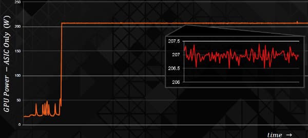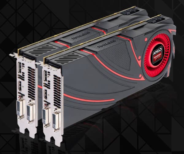 Естественно, что при потреблении энергии даже одночиповой видеокартой Radeon R9 290X, доходящем почти до 300 Вт, в случае двух GPU, работающих на той же частоте и имеющих то же количество активных функциональных устройств, энергопотребление двухчиповой карты никак не могло ограничиться планкой в 375 Вт, которая ранее была стандартом даже для мощных двухчиповых решений. Поэтому в AMD решили выпустить бескомпромиссное решение для энтузиастов, имеющее два 8-контактных разъёма дополнительного питания и требующее аж 500 Вт.
