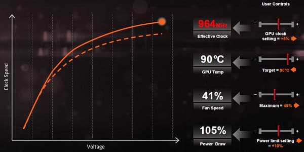 Кроме этого, PowerTune также обеспечивает и богатые возможности для разгона графического процессора Tonga. В настройках драйвера пользователь может установить несколько параметров, вроде целевой температуры GPU, относительной частоты вращения вентилятора в устройстве охлаждения, а также максимальный уровень энергопотребления, а всё остальное видеокарта сделает сама, установив максимально возможную частоту и другие параметры (напряжение GPU, частота вращения вентилятора) в изменившихся условиях.