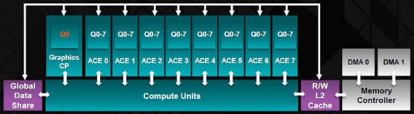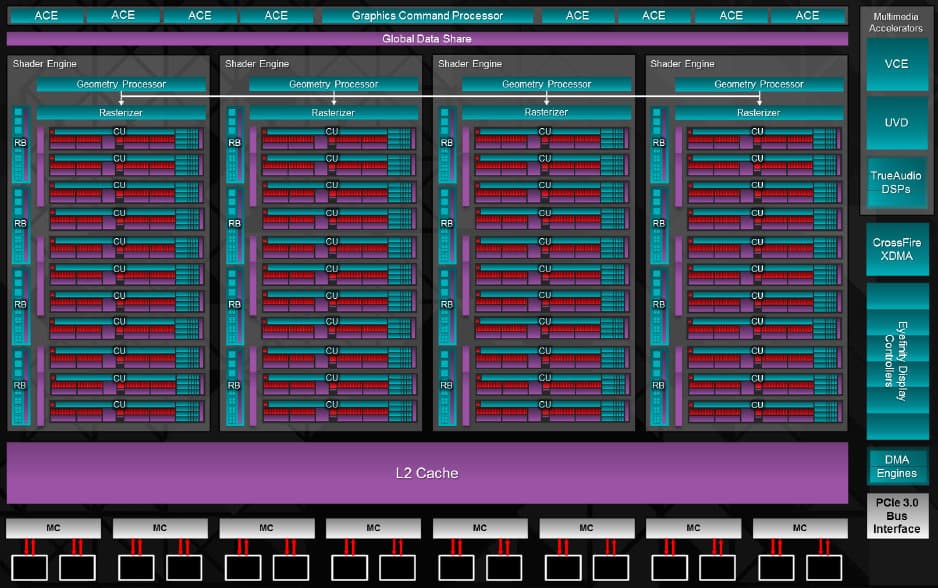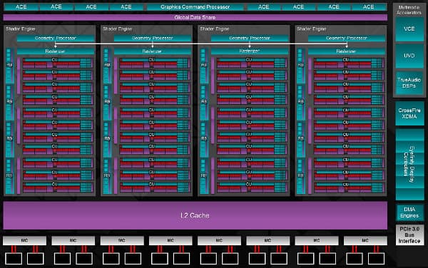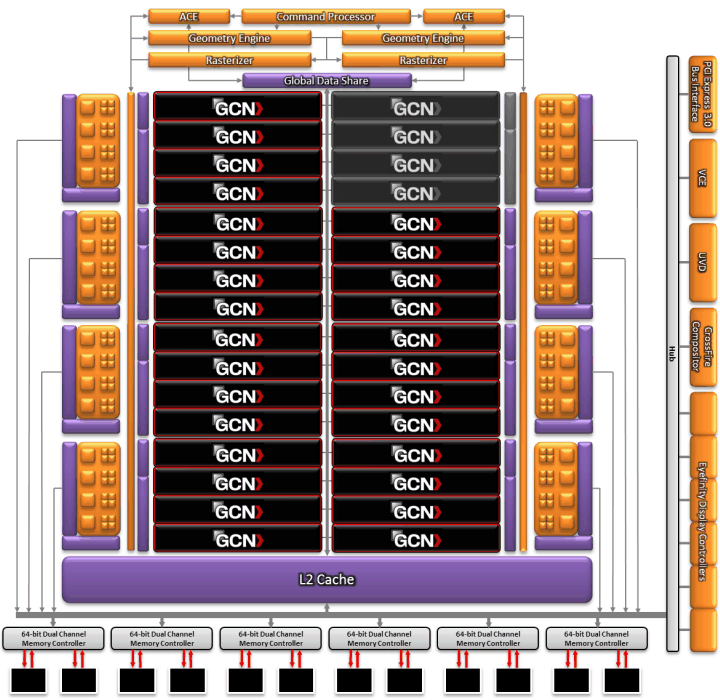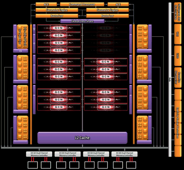Новый графический процессор логически разделён на четыре части (Shader Engine), каждая из которых содержит по 11 укрупнённых вычислительных блоков (Compute Unit), включающих и текстурные модули, по одному геометрическому процессору и растеризатору, а также по несколько блоков ROP. Иными словами, блок-схема самого современного чипа AMD стала ещё больше похожа на схему чипов NVIDIA, также имеющих подобную организацию.