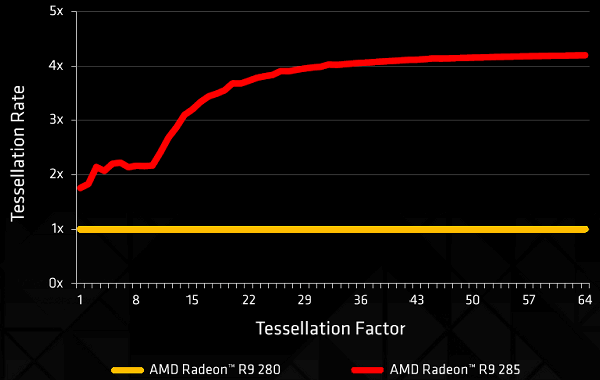 AMD заявляет, что в Tonga была улучшена обработка геометрии, как мы видели такое ранее в том же чипе Hawaii. Новый GPU умеет обрабатывать до четырёх примитивов за такт и обеспечивает вдвое-вчетверо большую производительность тесселяции в сложных условиях. Мы обязательно проверим эти данные в следующей части нашего материала, ну а пока что посмотрим на график от AMD: