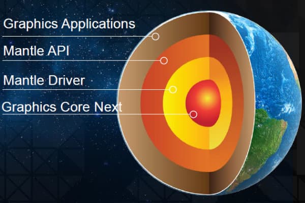 Новая видеокарта Radeon R9 285 поддерживает и другие технологии компании, о которых мы уже неоднократно писали в соответствующих обзорах. В частности, анонсированное решение обладает поддержкой нового графического API Mantle, который помогает более эффективно использовать аппаратные возможности графических процессоров AMD, так как Mantle не ограничен недостатками имеющихся графических API: OpenGL и DirectX. Для этого используется более «тонкая» программная оболочка между игровым движком и аппаратными ресурсами GPU подобно тому, как это давно делается на игровых консолях.