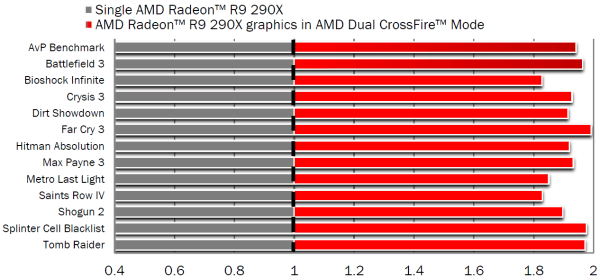 Для довольно достоверной оценки вероятной производительности двухчиповой новинки от AMD достаточно рассмотреть одни только теоретические показатели, по сравнению с одночиповой моделью Radeon R9 290X, так как в высоких разрешениях CrossFire обеспечивает близкую к 100% эффективность.