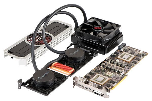 Так как даже один графический процессор Hawaii очень сильно греется, потребляя более 250 Вт в некоторых случаях, то в AMD решили использовать в двухчиповом решении систему водяного охлаждения, так как вода значительно (в 24 раза) эффективнее воздуха при передаче тепла. Если точнее, то специально сконструированное для Radeon R9 295X2 устройство охлаждения от компании Asetek является гибридным, так как сочетает охлаждение при помощи воды и воздуха для разных элементов видеокарты.