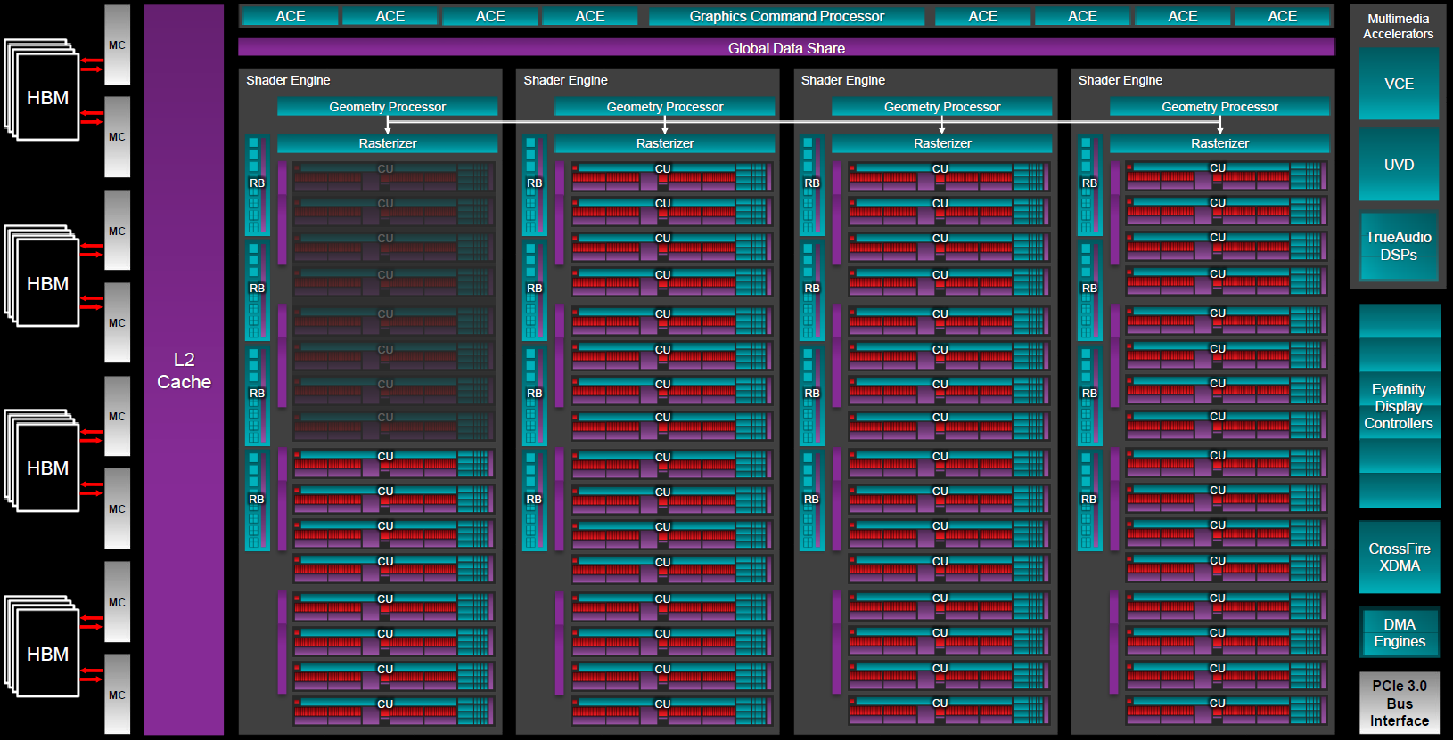 Общая схема графического процессора Fiji весьма схожа с той, что мы видели еще в чипе Hawaii, вышедшем в далеком уже 2013 году. Оба этих GPU разделены на четыре шейдерных движка Shader Engine, каждый из которых имеет свой собственный процессор для обработки геометрических данных и растеризатор, а также по четыре укрупненных блока ROP, способных обработать по 16 пикселей за такт (всего получается 64 блока ROP в каждом из этих чипов). GPU имеет единый командный процессор и восемь движков асинхронных вычислений Asynchronous Compute Engine, которые были модифицированы с учетом изменений в GCN 1.2.