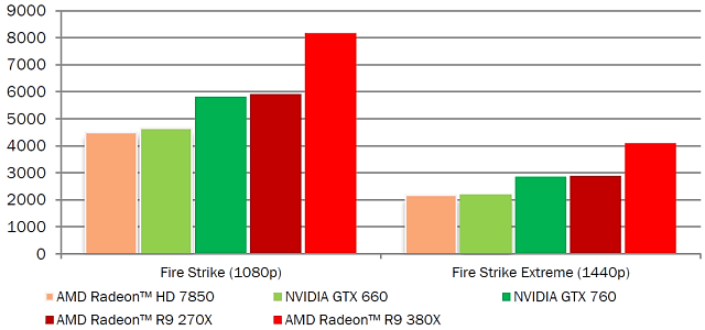 Позиционирование Radeon R9 380X в линейке графических решений компании AMD очень простое — новинка расположилась между моделями R9 380 и R9 390 и по производительности, и по цене. Что касается конкурента от Nvidia, то Radeon R9 380X не имеет прямого соперника по цене, а находится между двумя моделями GeForce: GTX 960 и GTX 970, но чуть ближе к первой. Сравнивать выгоднее с GTX 960, особенно в 3DMark Fire Strike, что AMD и делает: