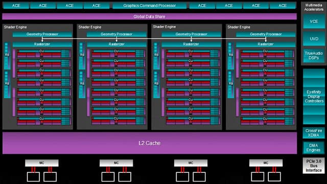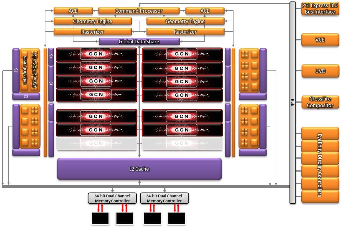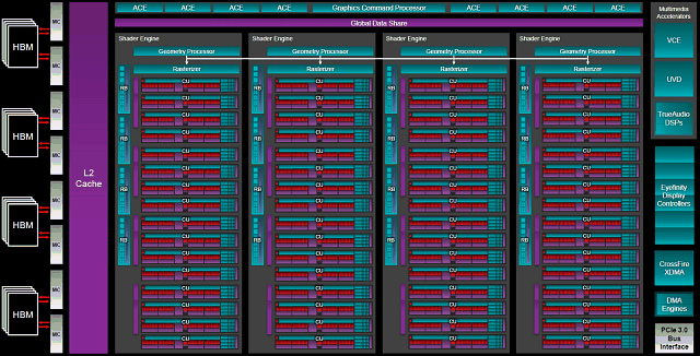 | Вычислительные блоки | 64 вычислительных блока GCN, включающих 256 SIMD-ядер, состоящих в общем из 4096 ALU для расчетов с плавающей запятой (поддерживаются целочисленные и плавающие форматы, с точностью FP32 и FP64) |