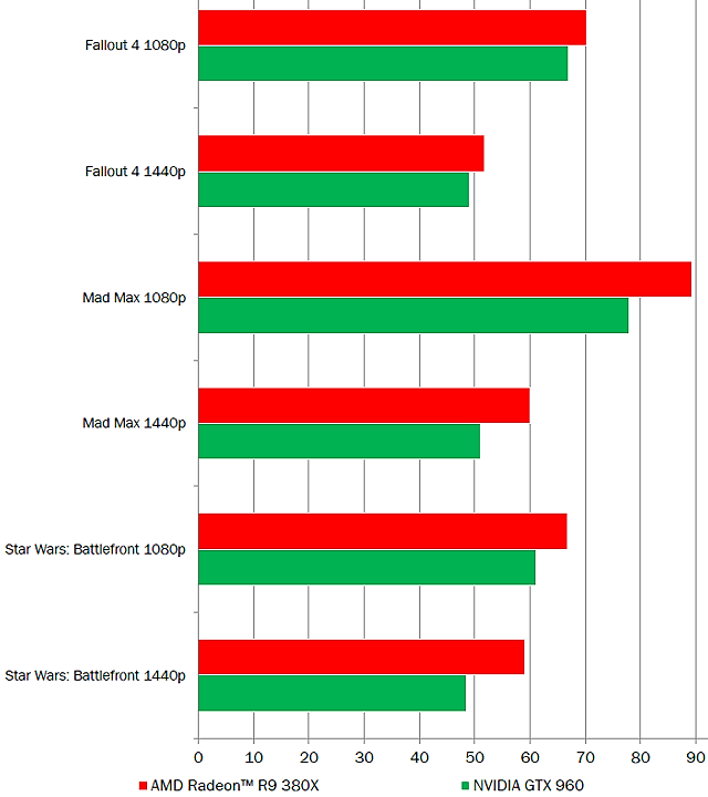 Остаётся посмотреть, как новинка справляется с самыми современными игровыми проектами, такими как Fallout 4, Mad Max и Star Wars: Battlefront. Сравнивается новая видеокарта от компании AMD снова с младшим из актуальных конкурентов производства Nvidia — GeForce GTX 960.
