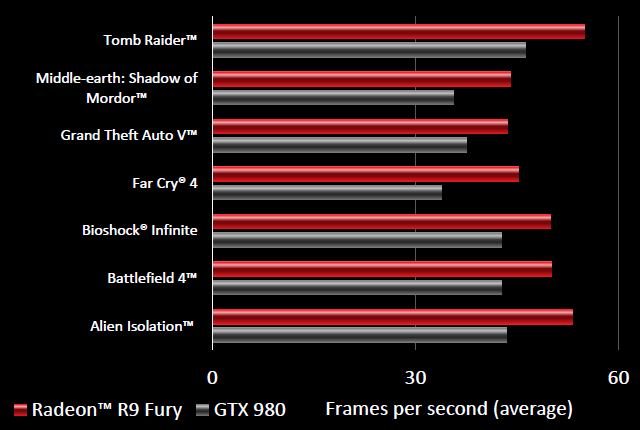 Хорошо видно, что за счёт преимущества в производительности и некоторых архитектурных решений (в том числе асинхронного выполнения шейдеров различных типов: пиксельных и вычислительных, к примеру), представленная на прошлой неделе видеокарта Radeon R9 380X опережает как старую уже GeForce GTX 760, так и вполне актуальную модель GTX 960, стоящую чуть меньше, правда.