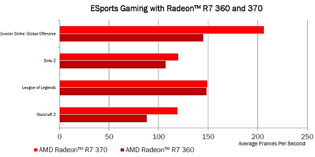 По тестам, проведённым специалистами AMD, их модель Radeon R7 360 оказывается в среднем быстрее GeForce GTX 750 в разрешении 1920×1080 и высоких настройках качества в наборе из пяти популярных игр. Ну и снова обратимся к теме многопользовательских игр, популярных в киберспорте, оценив скорость рендеринга Radeon R7 360 и 370 в таких проектах: