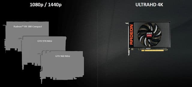 Что касается конкуренции с решениями Nvidia, то новинка соперничает с GeForce GTX 970 и GTX 960, старшая из которых быстрее и дороже, а младшая — медленнее и чуть дешевле. Так что в целом Radeon R9 380X довольно точно соответствует привычной концепции компании AMD, предлагающей свои видеокарты сравнимой производительности немного дешевле соперника, или выпуская видеокарты с близкой ценой, но чуть более быстрые. Это касается исключительно соотношения цены и производительности, по энергоэффективности решения AMD всё так же далеки от последних видеокарт Nvidia.