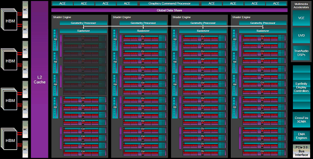 По сравнению с Hawaii, в плане организации инженеры компании AMD в чипе Fiji не тронули ничего, просто разместив большее количество вычислительных блоков Compute Unit в каждом движке Shader Engine (16 вместо 11), но оставили без изменений количество самих движков (вероятно, это — архитектурное ограничение GCN в ее нынешнем виде) и количество других исполнительных блоков в их составе.
