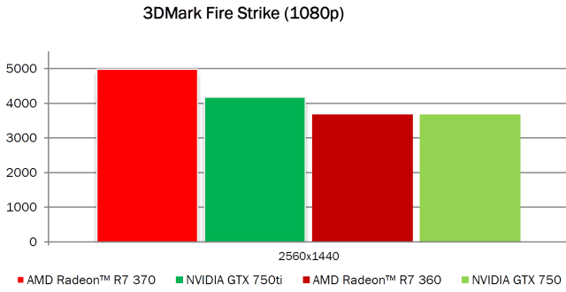 Нас скорее больше интересует сравнение с конкурентом, в качестве которого выступает модель видеокарты GeForce GTX 750 от компании Nvidia. Для начала рассмотрим сравнение сразу двух пар: двух моделей подсемейства Radeon R7 300 и конкурирующих с ними видеокарт Nvidia в синтетическом бенчмарке 3DMark Fire Strike в разрешении 1920×1080.