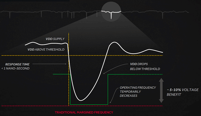 Адаптивное тактирование в решениях AMD восстанавливает эти потери со снижением энергозатрат на четверть. Для этого, в дополнение к уже существующим сенсорам энергопотребления и температуры добавляется еще и сенсор частоты. В результате работы алгоритма достигается максимальная энергоэффективность для всего чипа.