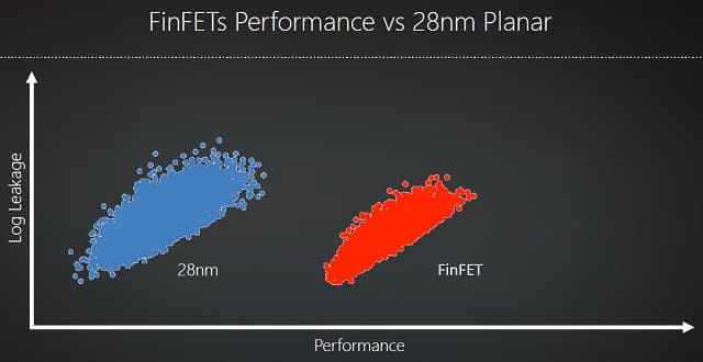 В FinFET-процессах многие проблемы решены, что позволяет добиться революционного улучшения в производительности и потреблении энергии, по сравнению с предыдущими чипами, произведенными при помощи традиционных технологий. Новые техпроцессы позволяют не просто повысить производительность, но и снизить вариативность характеристик (разницу в характеристиках всех произведенных чипов одной модели) — сравните разброс параметров для FinFET-техпроцесса 14 нм и привычного 28 нм у TSMC: