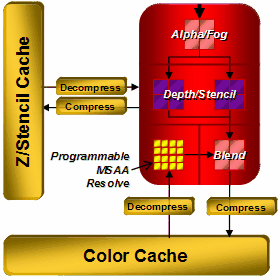 - 2 x 16 блоков ROP с поддержкой режимов антиалиасинга с возможностью программируемой выборки более чем 16 сэмплов на пиксель, в том числе при FP16 или FP32 формате буфера кадра. Пиковая производительность до 16 отсчетов за такт, в режиме без цвета (Z only) 32 отсчета за такт