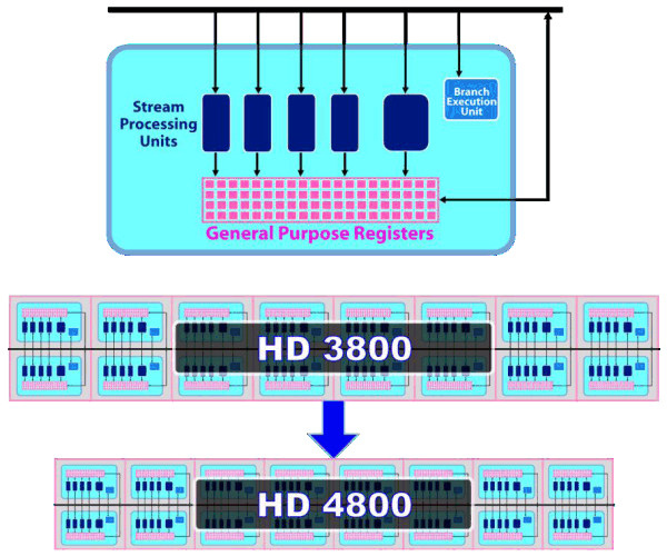 Основная часть видеочипа RV770 состоит из десяти SIMD ядер, каждое из которых содержит по 16 блоков суперскалярных потоковых процессоров, всего их в чипе 160 штук. Суперскалярность этих процессоров не изменилась со времён RV670, поэтому можно считать, что чип содержит 160*5=800 скалярных 32-битных потоковых процессоров. Для 64-битных расчётов двойной точности используются эти же блоки, снижается только темп расчётов.