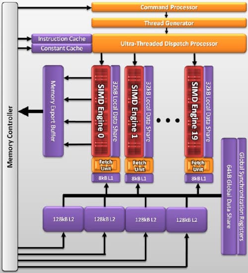 - 20 SIMD ядер, включающих 1600 скалярных ALU для расчётов с плавающей точкой (целочисленные и плавающие форматы, поддержка FP32 и FP64 точности в рамках стандарта IEEE 754)