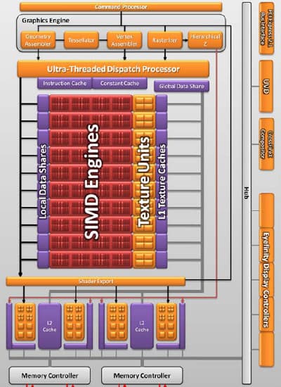 Хотя кардинальных изменений в RV8xx нет, это развитие идей предыдущих поколений, небольшие модификации затронули практически все блоки чипа: потоковые вычислительные блоки, текстурные модули, блоки ROP, контроллеры устройств вывода. Схема чипа Juniper весьма похожа на ту, что мы видели в разделе Cypress выше: