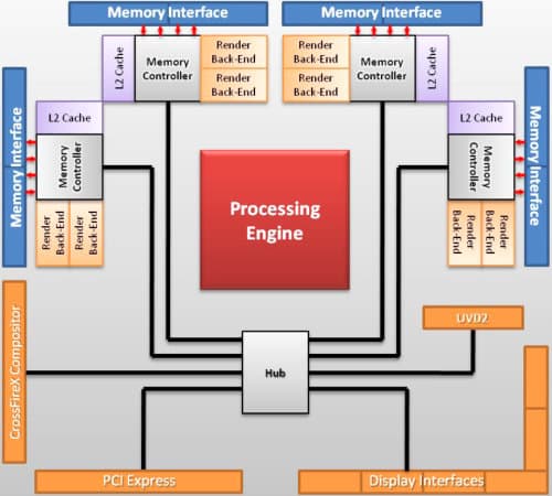 Можно сказать, что кардинальных изменений в чипе нет, это просто развитие идей предыдущих поколений. Но небольшие модификации затронули почти все блоки: потоковые вычислительные блоки, текстурные модули, блоки ROP, контроллеры устройств вывода. Изменения небольшие, поэтому схема чипа изменилась слабо: